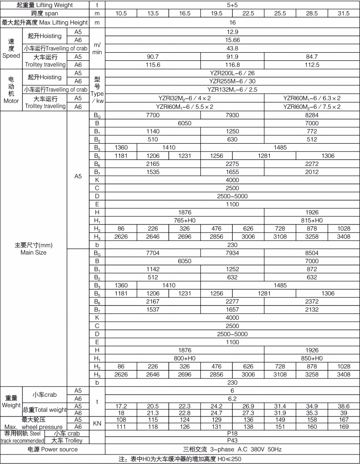 本起重机采用挂梁吊运长件钢坯、板材、棒材、盘圆等物品,配置电磁吸盘或夹钳或特殊群钩进行吊装,主要由箱形桥架、起重小车、大车运行机构、司机室和电气控制系统组成,配有停电保磁系统。起升机构多采用单电机、双减速器、双卷筒布置,呈双吊点形式。挂梁布置形式分垂直于主梁或平行于主梁两种。其余形式与QD型起重机相同。