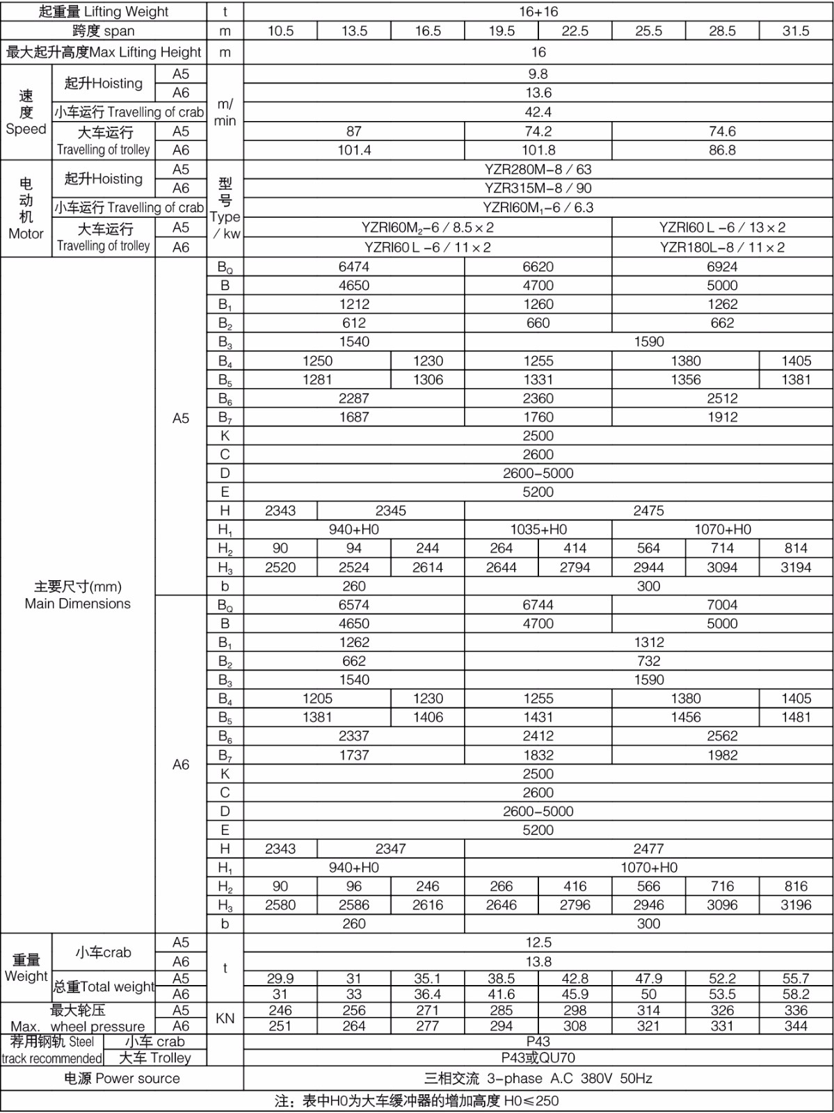 本起重机采用挂梁吊运长件钢坯、板材、棒材、盘圆等物品,配置电磁吸盘或夹钳或特殊群钩进行吊装,主要由箱形桥架、起重小车、大车运行机构、司机室和电气控制系统组成,配有停电保磁系统。起升机构多采用单电机、双减速器、双卷筒布置,呈双吊点形式。挂梁布置形式分垂直于主梁或平行于主梁两种。其余形式与QD型起重机相同。