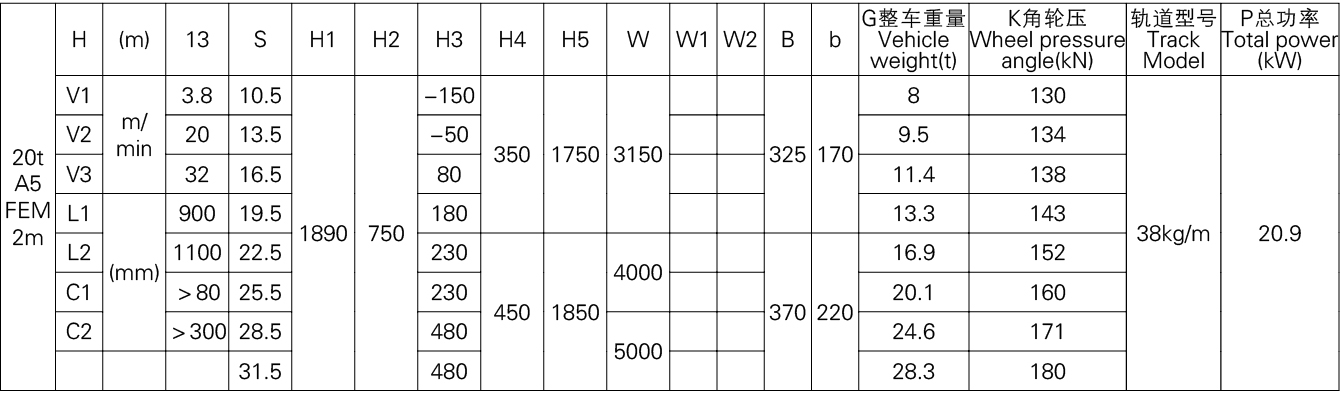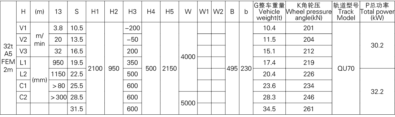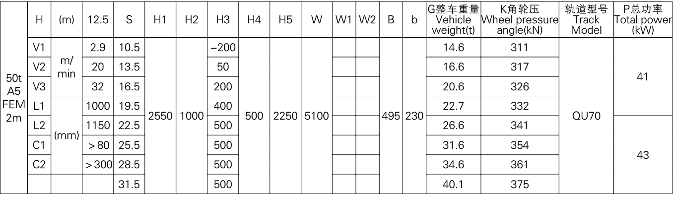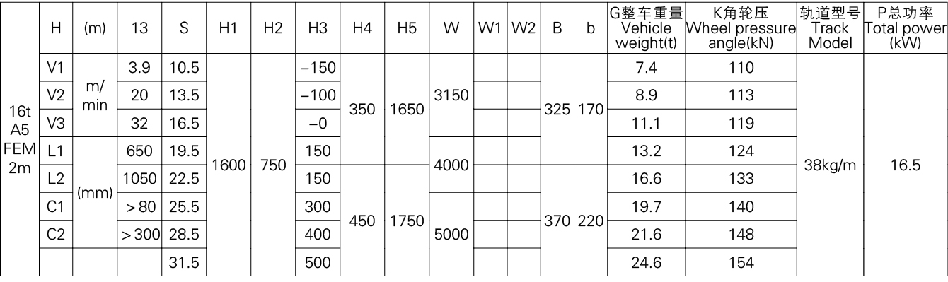 1、本产品系列表仅列出了常用的基本的规格起重机,工作级别为A5(FEM 2m)时的标准跨度,没有副钩的室内用起重机。客户根据需要可以提出相应的要求。